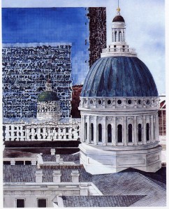 Highly detailed watercolor and pencil drawing of the old Courthouse in downtown St. Louis and reflections nearby -prints 19″x26″ signed/numbered $145.00
